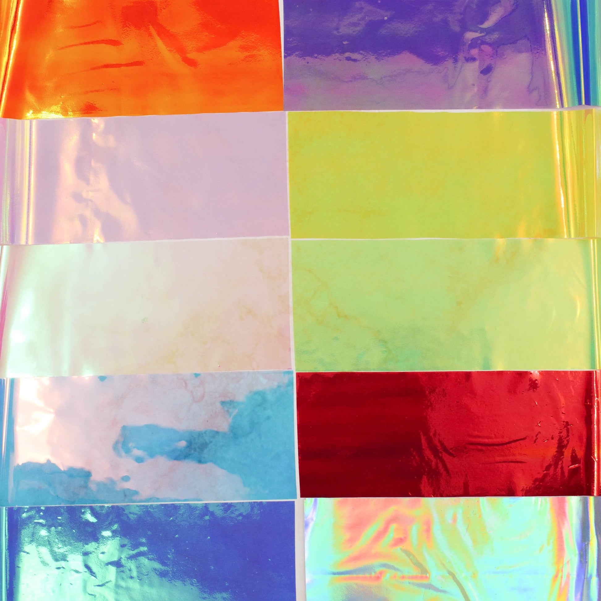 Beautiful iridescent glass film paper in 10 different colors. Perfect for adding reflective iridescent accents on any manicure, these are a must have for creating the popular aurora nail look!